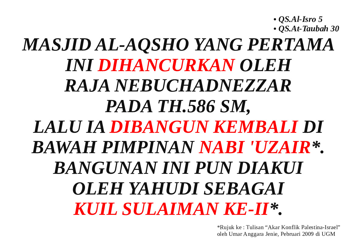 – Masjid Al-Aqsho yang dibangun oleh Nabi Sulayman ‘alayhis salam dihancurkan oleh Raja Nebuchadnezzar (Bukhtanashar, menurut sebutan bangsa ‘Arab) dalam sebuah penyerangan ke atas Baytul Maqdis pada th.586 SM. Saat itu kota Baytul Maqdis (Jerusalem) di bawah binaan Kerajaan (Yahudi) Judah, dengan Raja Jehoiakim.