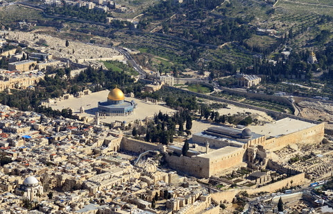 | Keseluruhan Masjid Al-Aqsho adalah kompleks bangunan yang dikelilingi oleh tembok persegi-panjang sembarang. Nampak foto kompleks dari sisi barat-daya. Bangunan paling selatan dengan kubah biru kehitaman sering ditunjuk oleh Yahudi sebagai Masjid Al-Aqsho, padahal ia adalah Musholla Jami’ Qibliy. |
